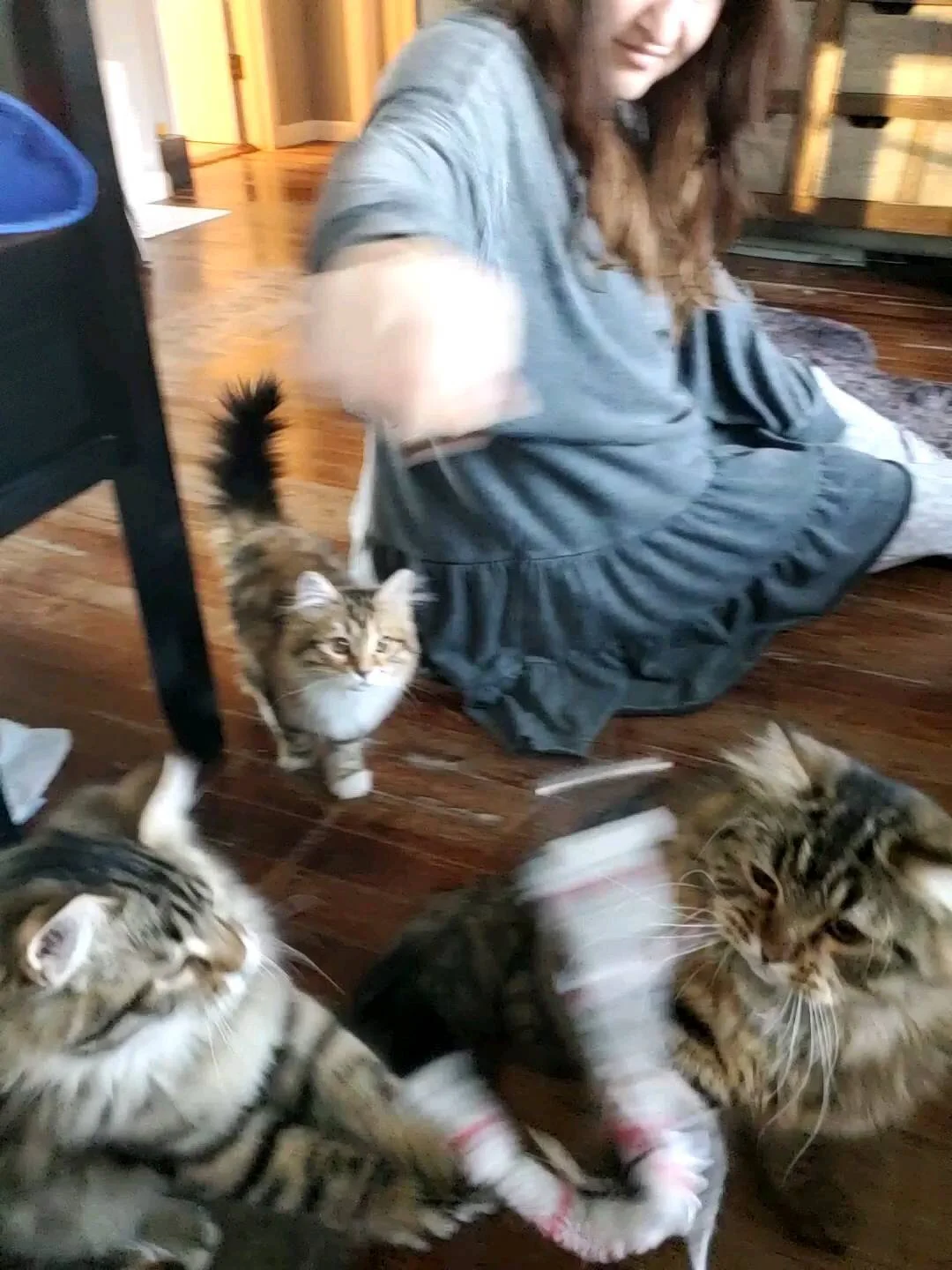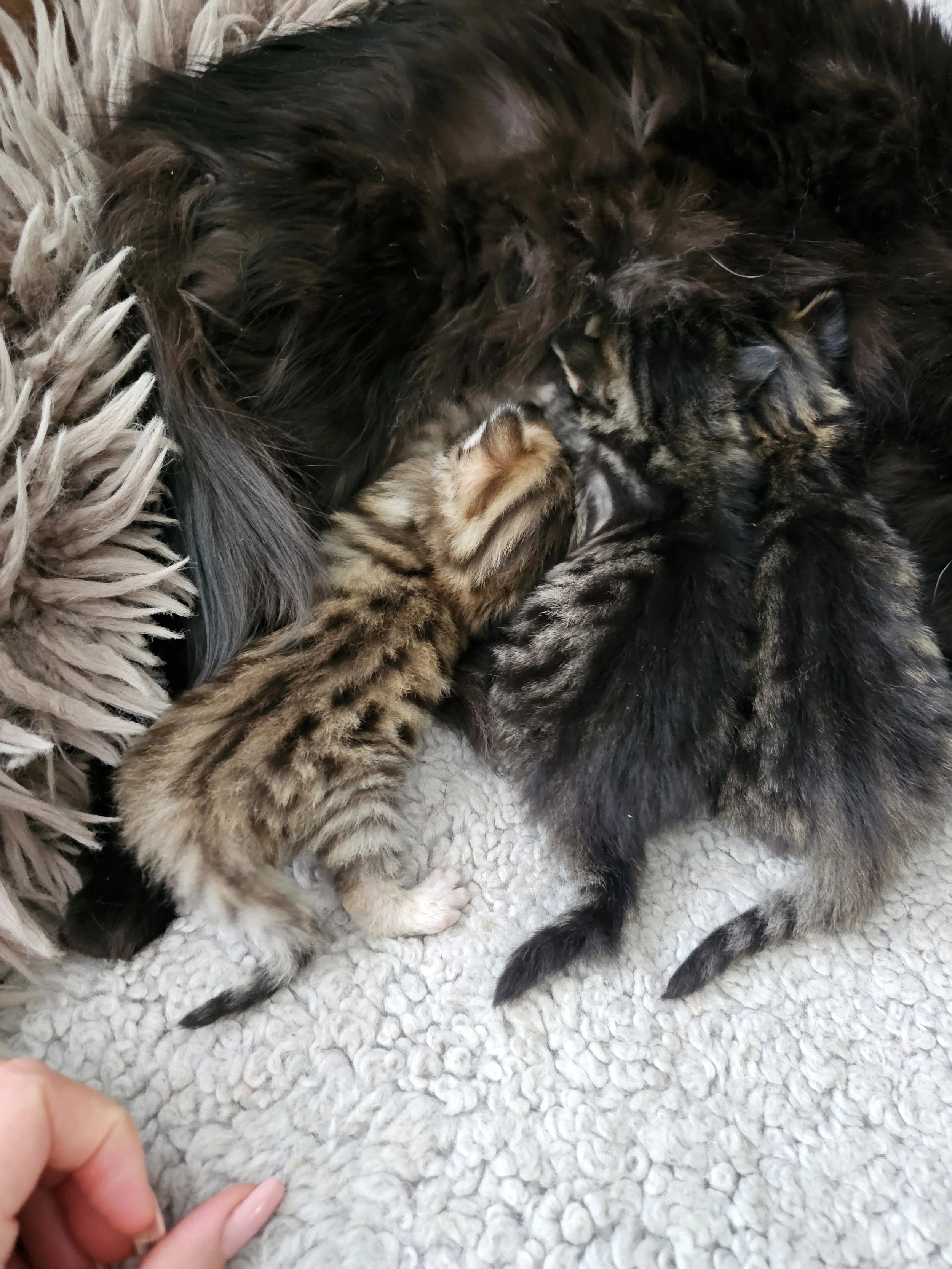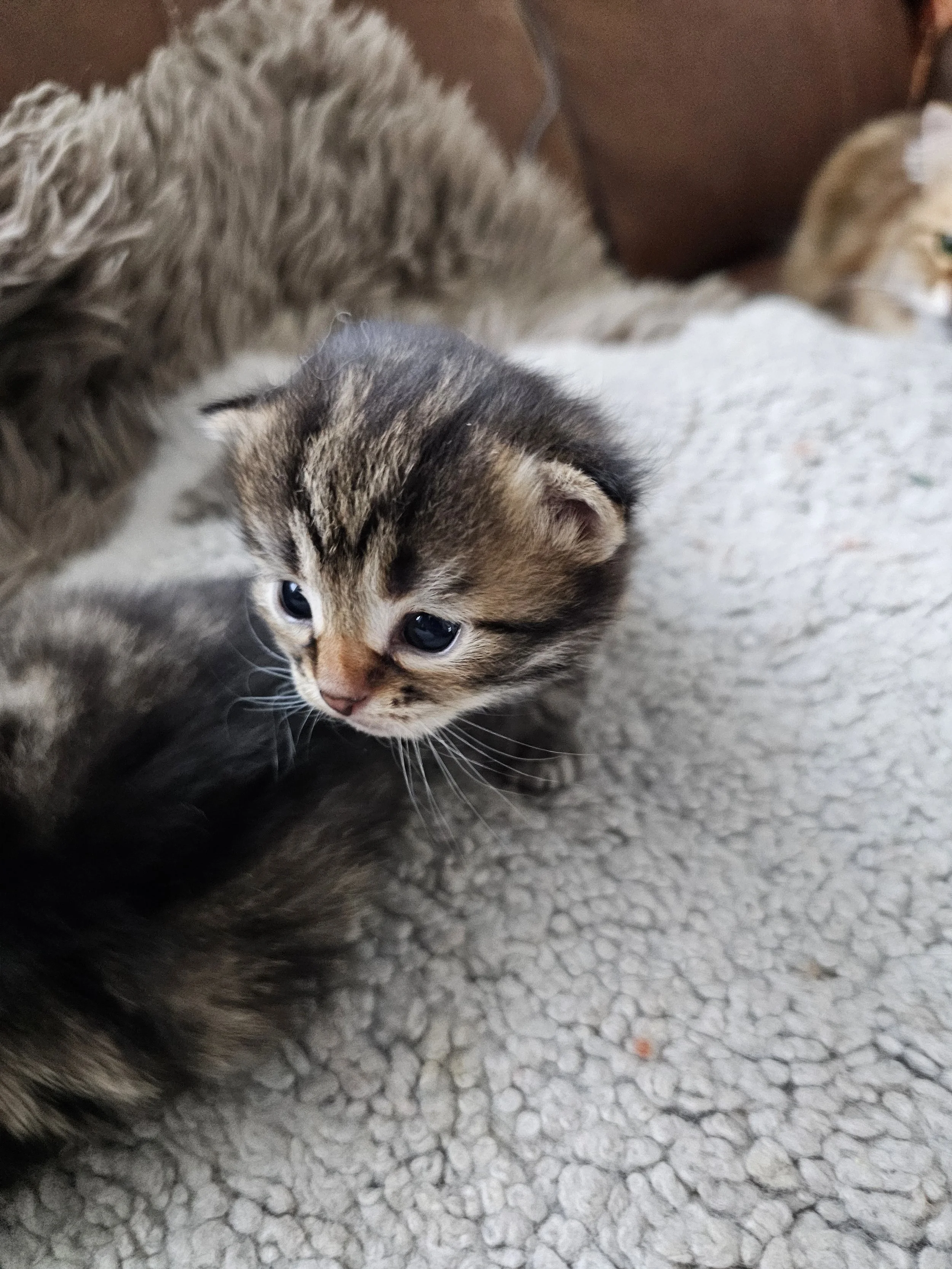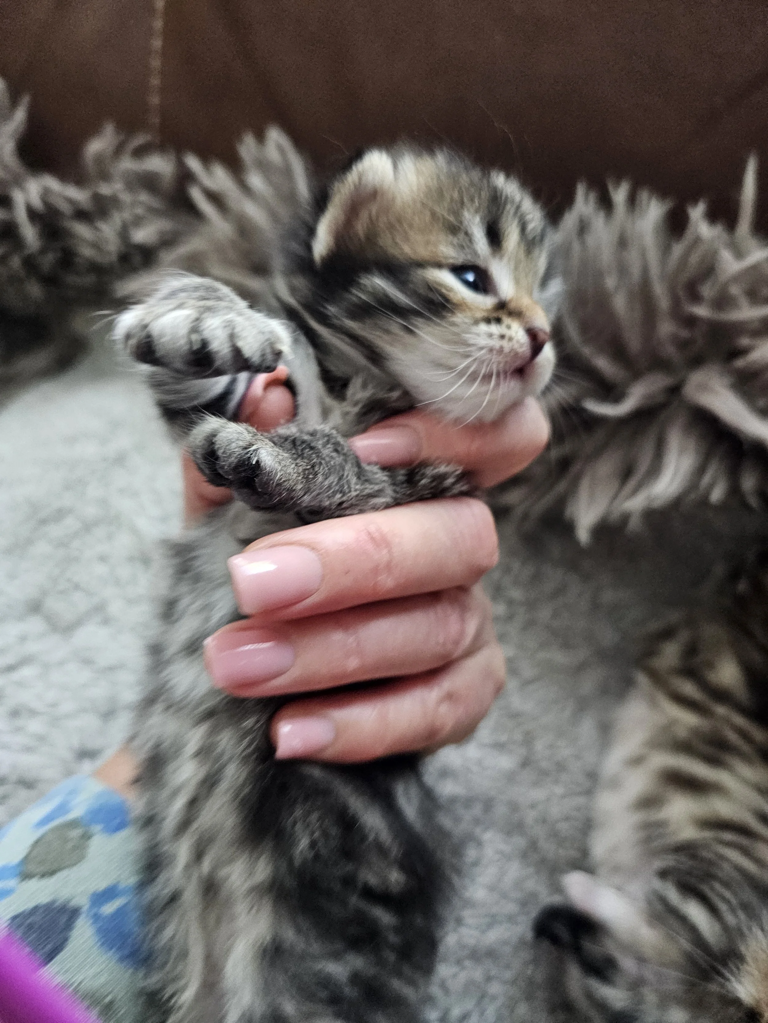 This little girl have black strips throughout her body and some more gold with white on her face. Colors are just shimmer on her fluffy body. She have very similar sister, we call them tweeness.
