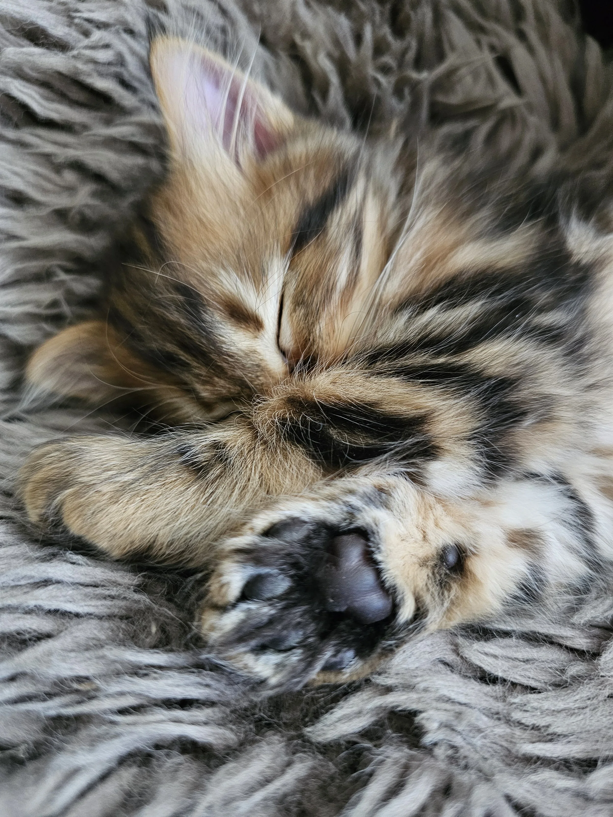 Born at Ropalo Siberians Cattery with distinguished European roots, this stunning few-weeks-old female Siberian kitten shines in golden hues, elegantly marked with black stripes and swirling marble patterns. Light accents of white gently decorate her face and belly, highlighting her soft, luxurious coat. Even at this young age, she already shows the proud lineage and captivating appearance that embody the best traits of the Siberian breed. Her father, Malahite Crown of Siberia (ny22 Black Golden Blotched), and her mother, Fekla Ropalo Siberian (black (n) with some brown marble underneath), pass down not only their physical beauty but also the playful and affectionate personality traits that make Siberians so adored. This little lady promises both a striking companion and a gentle, loving friend for her future family. AA Ropalo Siberian is a purebred, hypoallergenic, traditional Siberian kitten with a very strong pedigree. Her breed came from reputable catteries in Russia. She has a shiny, silky coat, bright curious eyes, and a confident, playful, affectionate personality that makes her unique and charming.